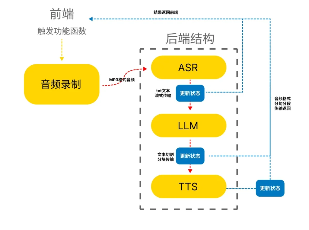 初始为 idle 闲置状态,当用户触发提问功能时,状态机改变为 Recording 聆听记录语音,同时状态机告诉后端ASR模块可以开始处理语音Chunk,以及告诉前端UI可以更新ASR传回的文本内容。